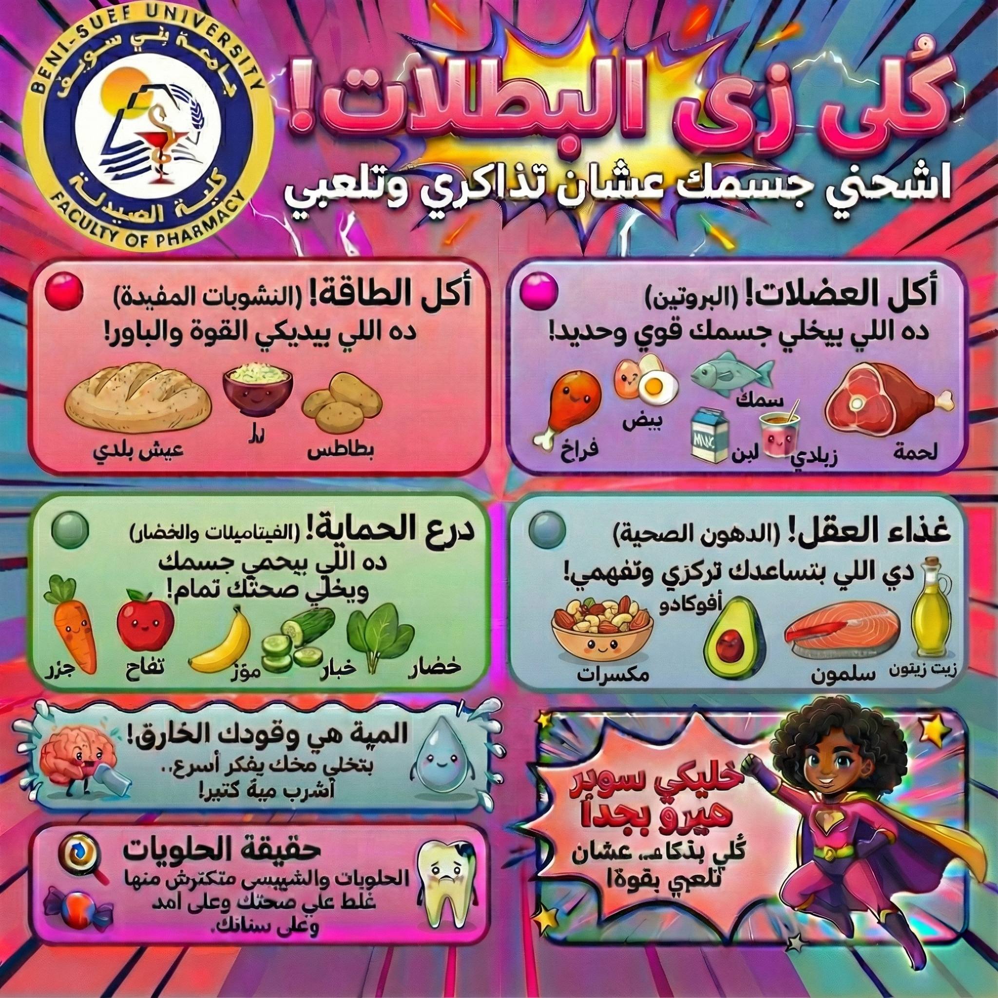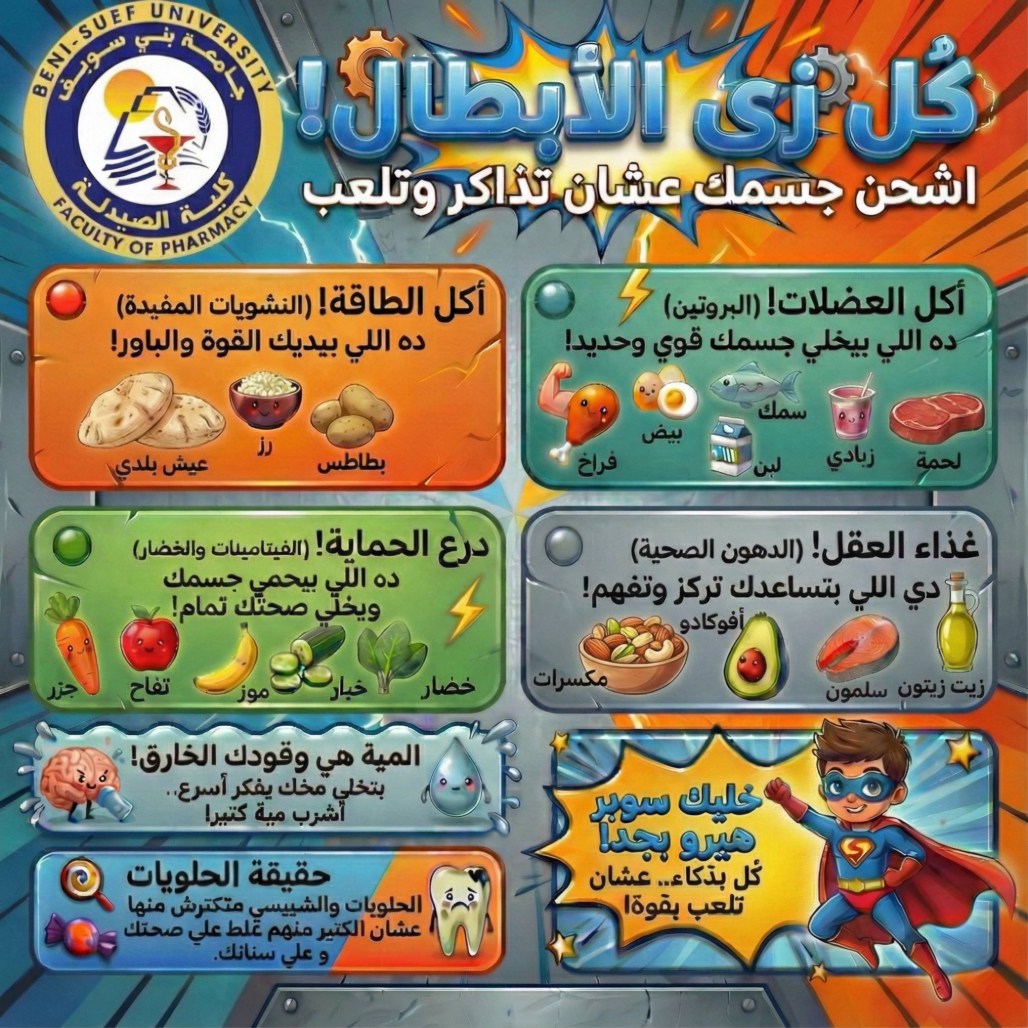 اطلقت كلية الصيدلة يوم الخميس الموافق ٤-١٢-٢٠٢٥ احدى حملات التوعيه المجتمعية والتى استهدفت طلاب المرحله الابتدائيه بمدرسه صلاح الدين فيوتشر ستارز، وكانت الحمله تتضمن التوعية عن الغذاء الصحى لطلاب المرحلة الابتدائية تحت شعار: