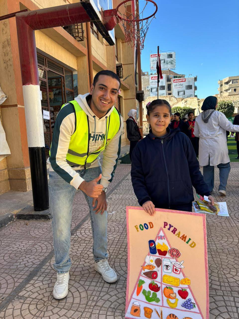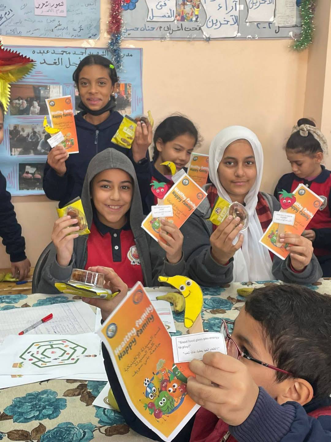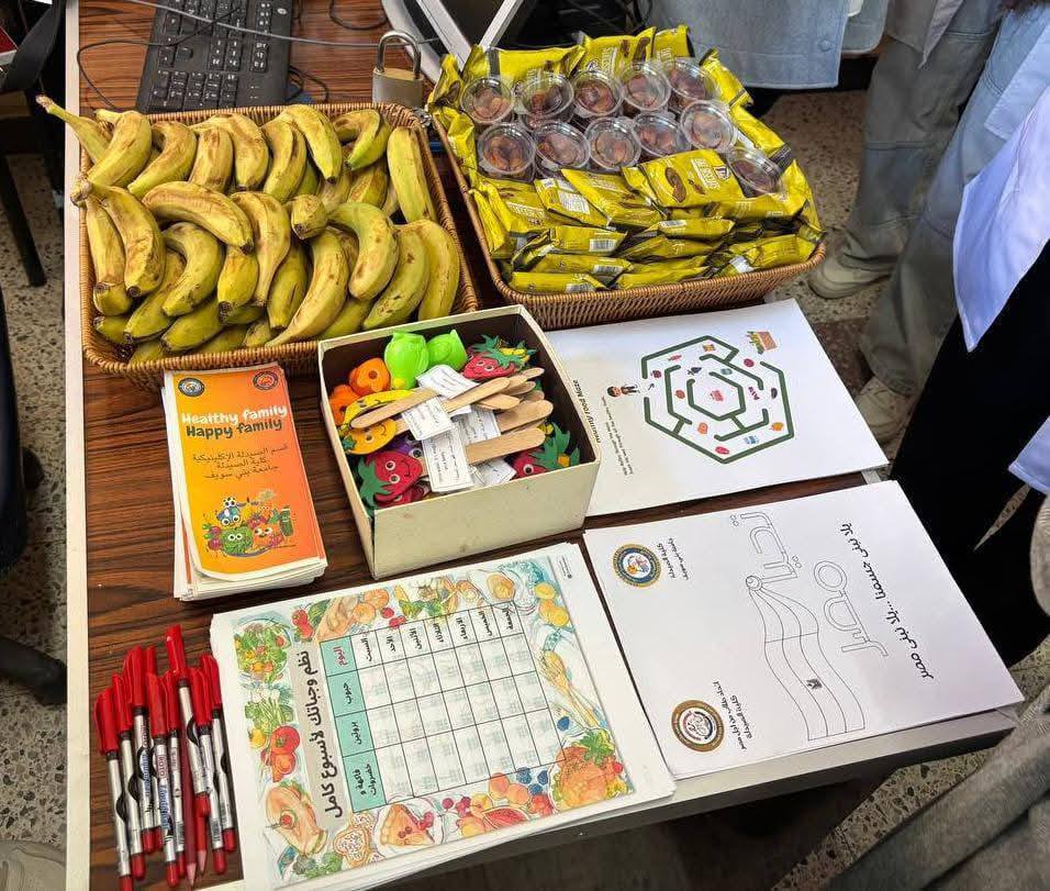 وقام طلاب الكليه والاسره بتوزيع المطويات الخاصه باليوم وجدوال الاطعمه المختلفه وبعض النصائح وبعض الاطعمه الصحية مثل التمر والموز وبسكوت الشوفان