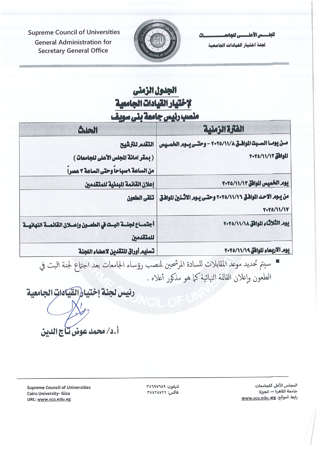 إعلان الجدول الزمني لإختيار القيادات الجامعية (منصب رئيس جامعة بني سويف)