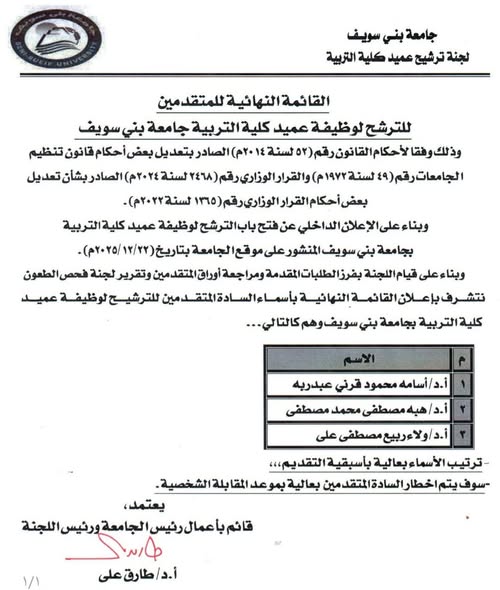 القائمة النهائية للمتقدمين للترشح لوظيفة عميد كلية التربية جامعة بنى سويف