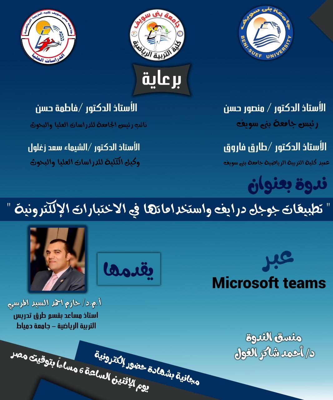 2021-03-08 الندوة الافتراضية لكلية التربية الرياضية جامعة بني سويف بعنوان تطبيقات جوجل درايف واستخداماتها في الاختبارات الإلكترونية